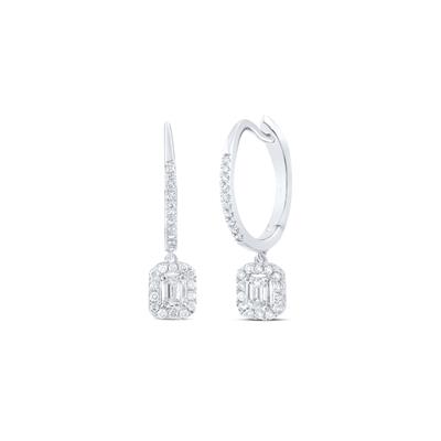 • 14K White Gold Emerald Diamond Hoop Dangle Earrings 0.50 Cttw