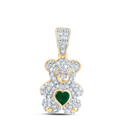 10K Yellow Gold Natural Diamond 3x3mm Emerald Heart Teddy Bear Pendant 0.50 Cttw