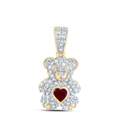 10K Yellow Gold Natural Diamond 3x3mm Ruby Heart Teddy Bear Pendant 0.50 Cttw