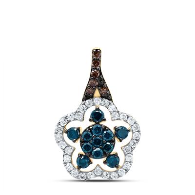 10K Yellow Gold Natural Diamond Cognac Blue Diamond Flower Pendant 0.50 Cttw